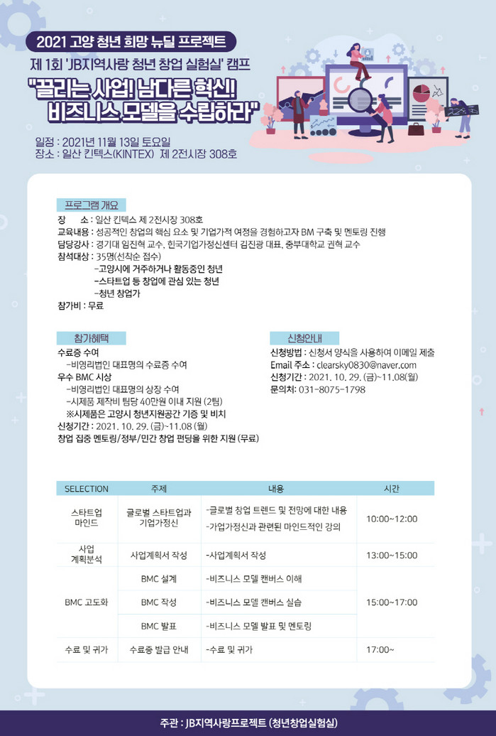[부자동네타임즈 김인수기자] 고양시가 오는 11월 13일 킨텍스 제2전시장 308호에서 청년 창업을 지원하는‘JB지역사랑 청년 창업 실험실’을 운영한다.
