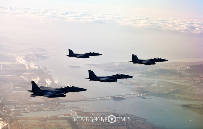 2016년 새해맞이 초계비행에 나선 공군 F-15K 편대가 인천광역시 서구와 영종도를 연결하는 영종대교 상공을 비행하는 모습. 영종대교 주변(사진 아래쪽)으로 서해와 경인아라뱃길을 연결하는 아라서해갑문과 인천터미널물류단지가 보인다. 2015.12.31.(사진=공군본부 제공)