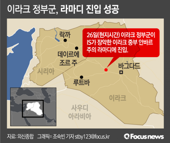 (서울=포커스뉴스) 이라크 정부군이 수니파 극단주의 무장세력 이스람국가(IS)의 전략적 요충지였던 이라크 중부 안바르주의 주도 라마디를 장악하는 데 성공했다.