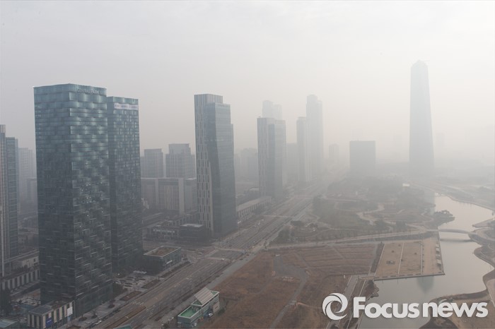 기상청 관계자는 "야외활동을 삼가하고 외출시에는 마스크를 착용해야 한다"고 당부했다.(인천=포커스뉴스) 중국발 스모그의 영향으로 미세먼지 농도가 높아진 24일 오전 인천 연수구 송도동 도심이 뿌옇게 보이고 있다. 2015.12.24 오장환 기자 <자료제공=기상청>