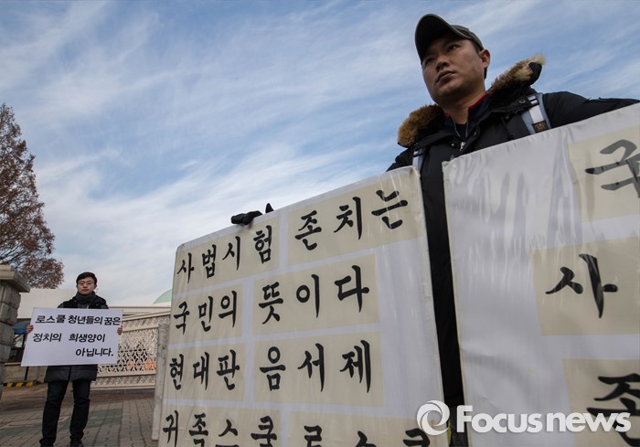 재판부는 “행정처분의 위법 여부를 가리기 위해서는 처분 당시를 기준으로 판단해야 한다”며 “법무부의 이번 사시 폐지 유예 발표는 변호사시험 공고 이후에 나온 것으로 변호사시험 공고의 위법 여부를 판단하는 기준이 될 수 없다”고 판시했다.(서울=포커스뉴스) 사법시험 존폐에 관한 논쟁이 격화되고 있는 가운데 9일 오전 서울 여의도 국회 앞에서 사법고시 존치를 주장하는 1인 시위 뒤로 서울대학교 로스쿨 2학년에 재학 중인 강태승씨가 사법시험 폐지 유예에 항의하는 1인 시위를 하고 있다. 2015.12.09 성동훈 기자