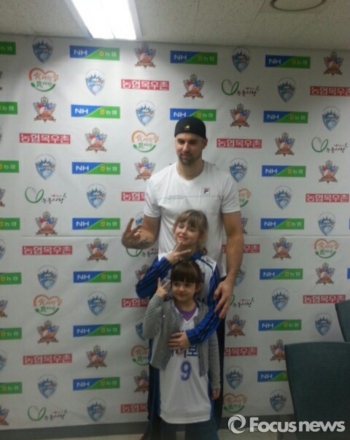 이날 그로저는 기자회견장에 각각 8살과 5살인 딸 레아나와 로레인을 대동해 눈길을 끌기도 했다. 그로저는 "아내와 두 딸이 나의 전부"라며 무한한 가족 사랑을 과시했다. 그로저는 한국에서 함께 머물던 가족과 함께 30일 독일로 출국해 독일 대표팀의 일원으로 2016 리우올림픽 예선에 출전할 예정이다.삼성화재 배구선수 그로저와 그의 두 딸 레아나(사진 중앙), 로레인(사진 하단). <사진=차상엽 기자> 2015.12.29 차상엽 기자