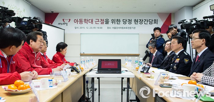 지난 12일 인천 연수구에서 친부로부터 2년여간 학대를 받은 11세 소녀가 자력으로 탈출한 사실이 알려지며 아동학대 근절을 위한 정부의 대책이 부실하다는 비판이 일었다.김무성(왼쪽 두번째) 새누리당 대표가 23일 오후 서울강서아동보호전문기관에서 열린 '아동학대 근절을 위한 당·정 현장간담회'에 참석해 모두발언 하고 있다. 2015.12.23 양지웅 기자