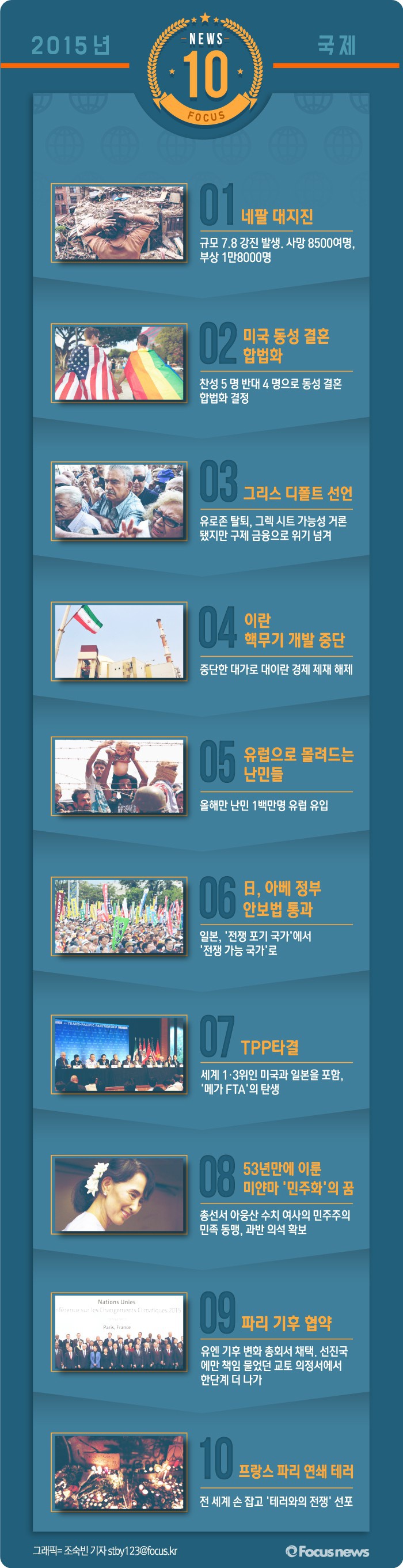 이외에도 그리스 디폴트, 미얀마 민주화, 미국 동성결혼 합법화 등 굵직한 이슈가 연이어졌던 2015년. 2015년 한해 세계에서 어떤 일이 벌어졌는지 10대 뉴스로 꼽았다.