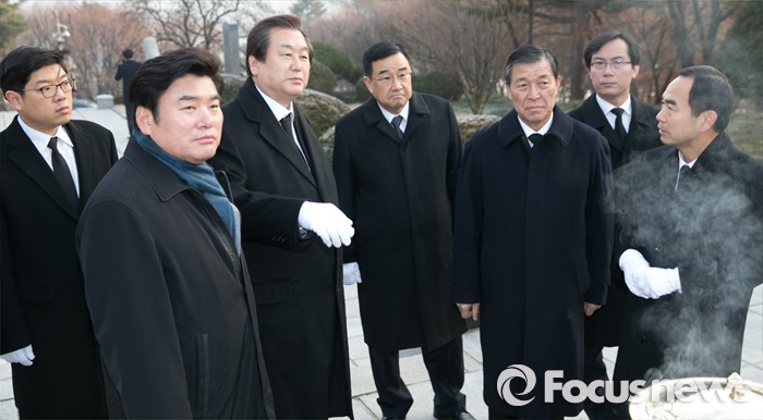 (서울=포커스뉴스) 병신년(丙申年) 새해 첫 날인 1일 오전 동작구 국립서울현충원에서 김무성 새누리당 대표 등 지도부가 이승만 전 대통령 묘역 참배를 마친 뒤 관계자에게 설명을 듣고 있다.