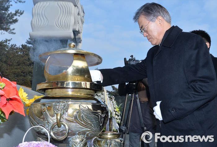 (서울=포커스뉴스) 병신년(丙申年) 새해 첫 날인 1일 오전 동작구 국립서울현충원에서 문재인 더불어민주당 대표가 김대중 전 대통령 묘역 참배를 하고 있다.