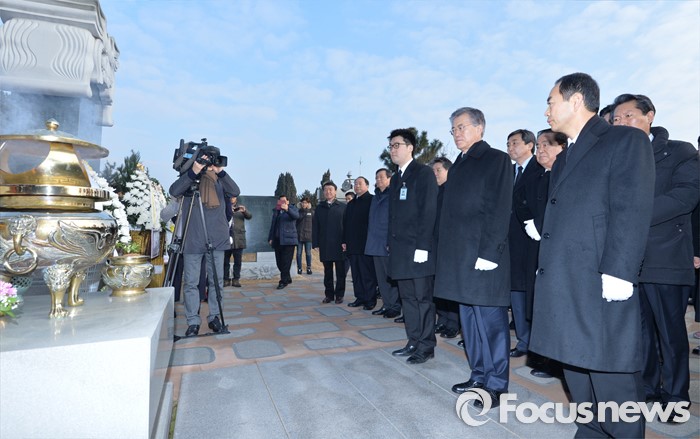 (서울=포커스뉴스) 병신년(丙申年) 새해 첫 날인 1일 오전 동작구 국립서울현충원에서 문재인 더불어민주당 대표 등 의원들이 김대중 전 대통령 묘역 참배를 하고 있다.