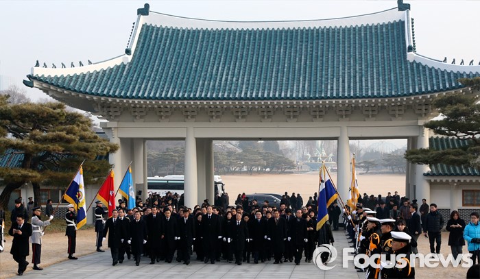 (서울=포커스뉴스) 병신년(丙申年) 새해 첫 날인 1일 오전 동작구 국립서울현충원에서 김무성 새누리당 대표 등 의원들이 현충탑 참배를 위해 이동하고 있다.