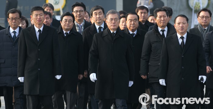 (서울=포커스뉴스) 병신년(丙申年) 새해 첫 날인 1일 오전 동작구 국립서울현충원에서 문재인 더불어민주당 대표 등 의원들이 현충탑 참배를 마친 뒤 이동하고 있다.