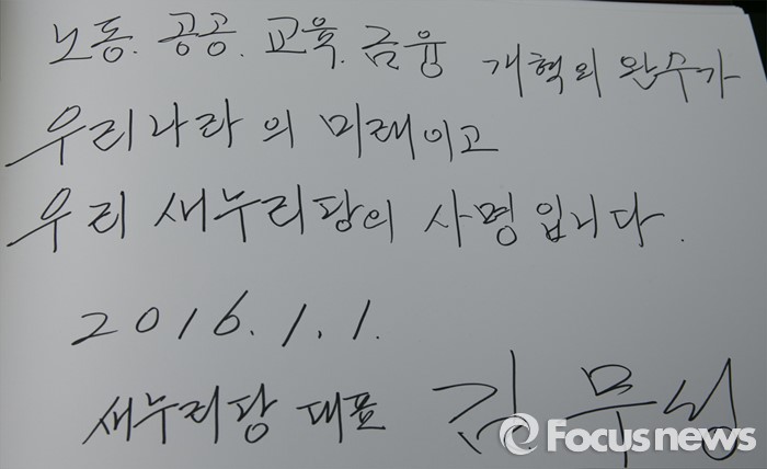 (서울=포커스뉴스) 병신년(丙申年) 새해 첫 날인 1일 오전 동작구 국립서울현충원에서 김무성 새누리당 대표가 현충탑 참배를 했다. 사진은 김 대표가 남긴 방명록.