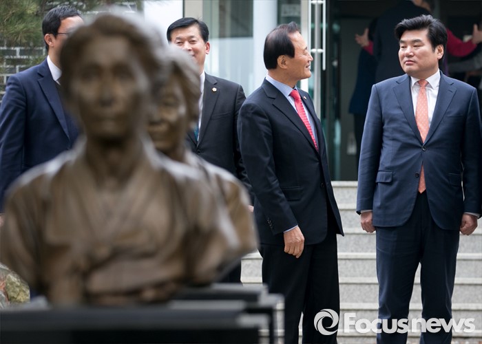 (광주=포커스뉴스) 병신년(丙申年) 새해 첫 날인 1일 오후 원유철 새누리당 원내대표 등 의원들이 경기도 광주 일본군 위안부 피해자 쉼터 나눔의 집을 방문해 간담회를 마친 뒤 나서고 있다.