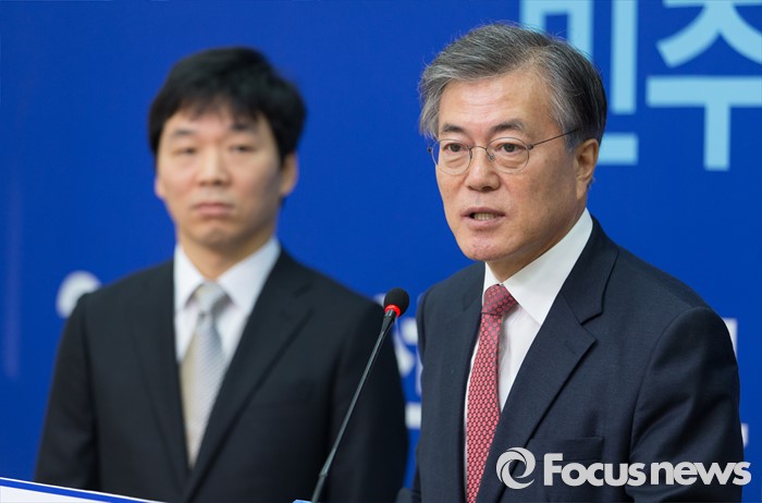 (서울=포커스뉴스) 문재인 더불어민주당 대표가 3일 오후 김병관 웹젠 이사회 의장으로부터 지역당원 입당원서를 전달 받고 취재진 질문에 답하고 있다.