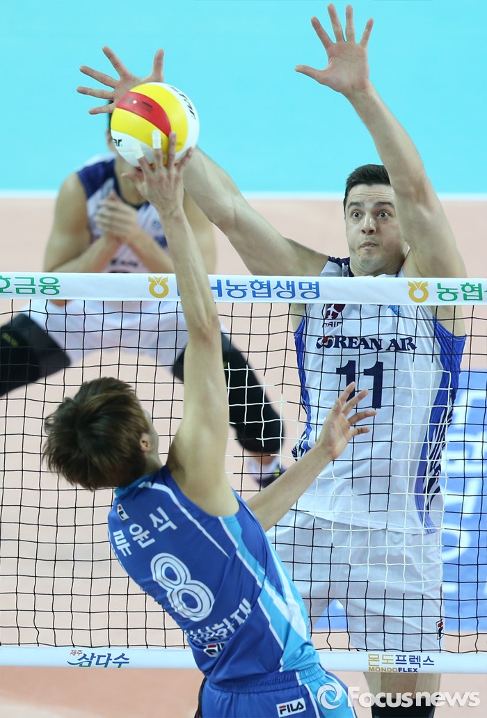 (인천=포커스뉴스) 3일 인천 계양체육관에서 열린 '2015-2016NH농협 V-리그' 남자부 대한항공-삼성화재 경기에서 대한항공 모로즈가 삼성화재 류윤식의 공격에 블로킹을 대고 있다.