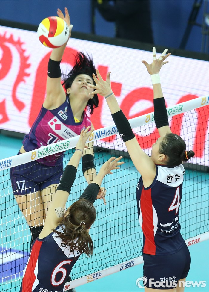 (인천=포커스뉴스) 3일 인천 계양체육관에서 열린 '2015-2016NH농협 V-리그' 여자부 흥국생명-KGC인삼공사 경기에서 흥국생명 이재영이 KGC인삼공사 한수지와 장영은의 블로킹을 앞에 두고 강스파이크를 날리고 있다.