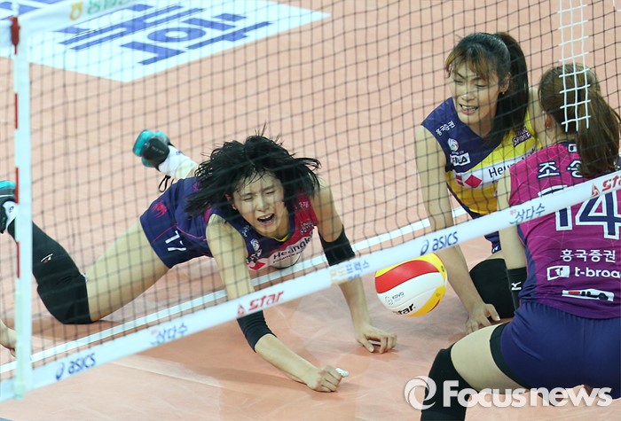 (인천=포커스뉴스) 3일 인천 계양체육관에서 열린 '2015-2016NH농협 V-리그' 여자부 흥국생명-KGC인삼공사 경기에서 흥국생명 이재영이 블로킹에 맞고 떨어지는 볼을 살리려고 몸을 날리고 있다.