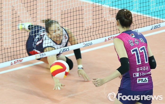 (인천=포커스뉴스) 3일 인천 계양체육관에서 열린 '2015-2016NH농협 V-리그' 여자부 흥국생명-KGC인삼공사 경기에서 흥국생명 김수지가 KGC인삼공사 이연주의 디그를 지켜보고 있다.