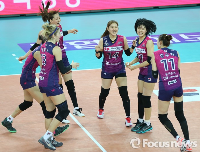 (인천=포커스뉴스) 3일 인천 계양체육관에서 열린 '2015-2016NH농협 V-리그' 여자부 흥국생명-KGC인삼공사 경기에서 KGC인삼공사에 3-2로 승리한 흥국생명 선수들이 기뻐하고 있다.