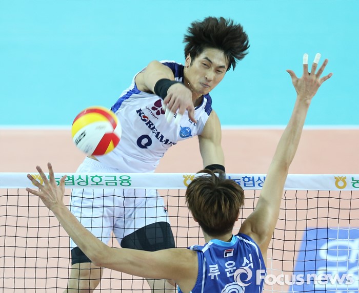 (인천=포커스뉴스) 3일 인천 계양체육관에서 열린 '2015-2016NH농협 V-리그' 남자부 대한항공-삼성화재 경기에서 대한항공 김학민이 삼성화재 류윤식의 블로킹을 피해 스파이크를 하고 있다.