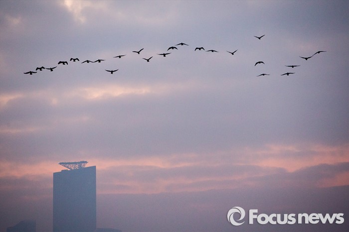 | △ 새해 첫 일출 위로 날아가는 철새들 |