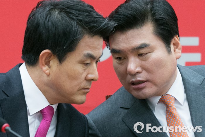 (서울=포커스뉴스) 원유철(오른쪽) 새누리당 원내대표와 김태호 최고위원이 4일 오전 서울 여의도 국회에서 열린 최고위원회의에 참석해, 대화하고 있다.
