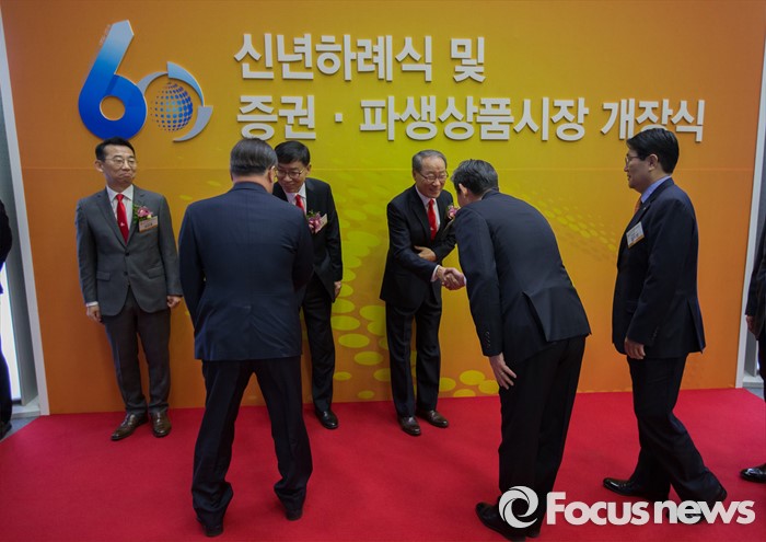 이 자리엔 임종룡 금융위원장, 진웅섭 금감원장, 최경수 한국거래소 이사장, 황영기 금투협회장 등이 참석했으며 60년동안 상장기업으로 남은 주식회사 경방의 김준 대표이사도 자리를 함께 했다.(서울=포커스뉴스) 병신년(丙申年) 새해 첫 증시 개장일인 4일 오전 영등포구 서울 여의도 거래소에서 2016년도 증권·파생상품시장 60주년 개장식 및 신년 하례식에서 임종룡 금융위원장이 참석자들과 인사를 나누고 있다 2016.01.04 김흥구 기자