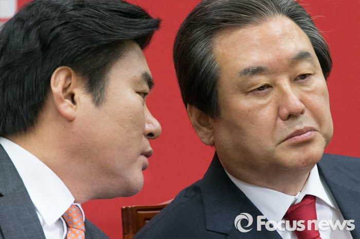 (서울=포커스뉴스) 김무성(오른쪽) 새누리당 대표와 원유철 원내대표가 4일 오전 서울 여의도 국회에서 열린 최고위원회의에 참석해, 대화하고 있다.