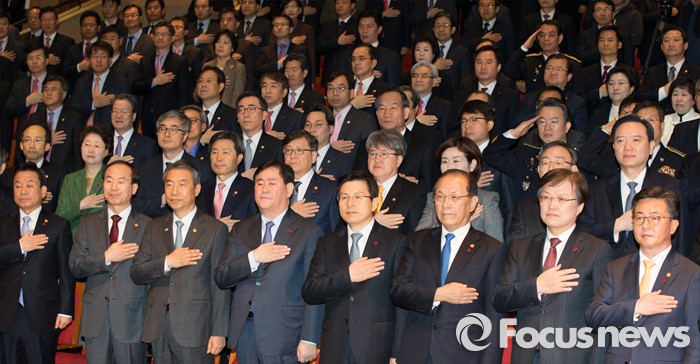 (세종=포커스뉴스) 황교안 국무총리와 각 부처 장·차관들이 4일 오전 세종시 정부세종청사 대강당에서 열린 2016년 정부시무식에 참석해 국기에 대한 경례를 하고 있다.