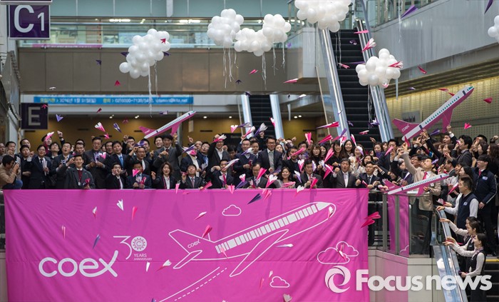 (서울=포커스뉴스) 4일 오전 서울 강남구 코엑스에서 열린 30주년 이색 시무식에 참석한 코엑스 임직원들이 종이비행기를 날리며 한 해의 힘찬 시작을 알리고 있다.