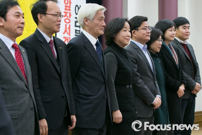 (서울=포커스뉴스) 심상정(왼쪽 네번째) 대표를 비롯한 정의당 지도부가 4일 오전 서울 여의도 국회 의원회관에서 열린 용산참사·세월호유족·시민사회단체 합동 신년인사회에 참석해, 인사하고 있다.