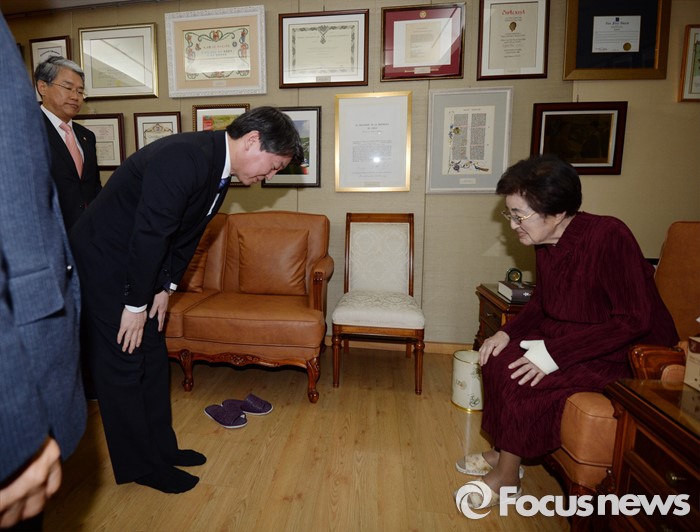 (서울=포커스뉴스) 신당 창당을 추진중인 무소속 안철수 의원이 4일 서울 동교동 고 김대중 전 대통령의 사저를 찾아 이희호 여사를 예방하고 새해 인사를 하고 있다.