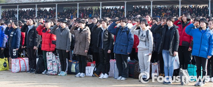(논산=포커스뉴스) 4일 오후 충남 논산 육군훈련소 입영심사대에서 여군 부사관 후보생들이 거수경례를 하고 있다.