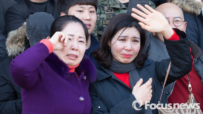 (논산=포커스뉴스) 4일 오후 충남 논산 육군훈련소 입영심사대에서 입영장병의 가족들이 손 인사를 하고 있다.