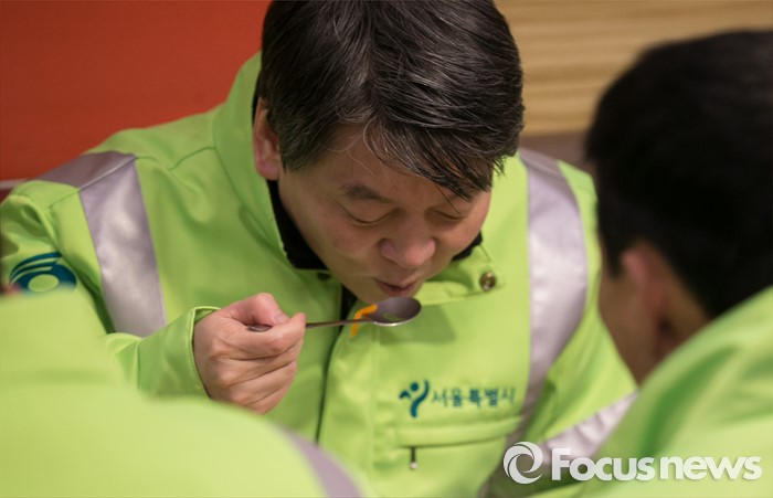 (서울=포커스뉴스) 신당 창당을 추진 중인 안철수 무소속 의원이 5일 오전 서울 영등포역 동부광장 인근에서 환경미화원들과 함께 새해맞이 청소를 마친 뒤 분식집에서 어묵탕 식사를 하고 있다.