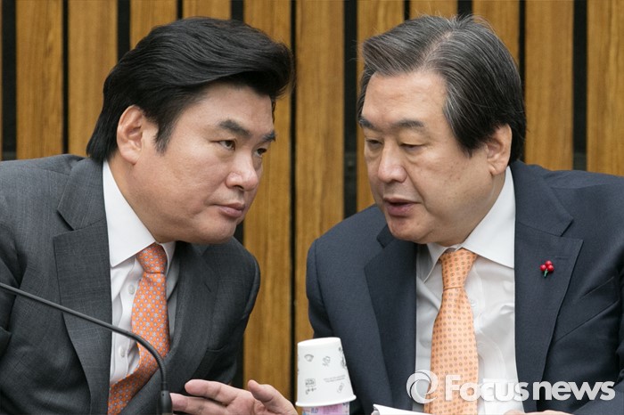 (서울=포커스뉴스) 김무성(오른쪽) 새누리당 대표와 원유철 원내대표가 5일 오전 서울 여의도 국회에서 열린 20대 총선 공약개발본부 발족식에 참석해 논의하고 있다.