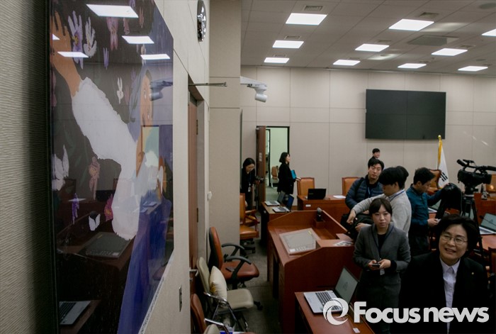 (서울=포커스뉴스) 5일 오전 서울 여의도 국회에서 열린 여성가족위원회 전체회의에 故 김순덕 위안부 피해 할머니 유작 '끌려감'이 걸려 있다. 이날 여가위는 한일 위안부 합의와 관련 여성가족부의 현안보고를 들으려 했으나, 여야 간사간 협의가 이루어지지 않은 점을 들어 여당 의원과 김희정 장관은 참석하지 않았다.