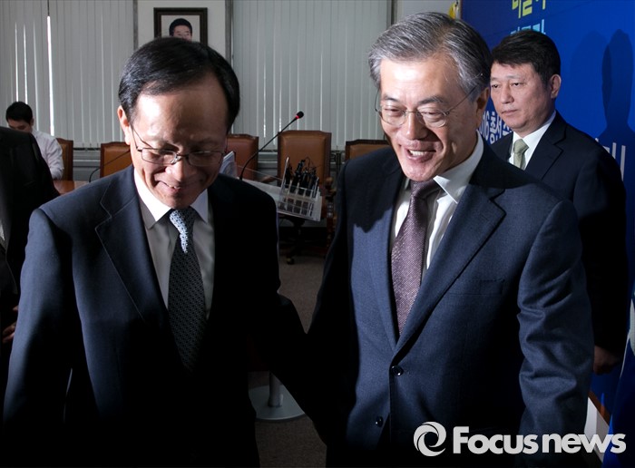 (서울=포커스뉴스) 문재인(오른쪽) 더불어민주당 대표가 5일 오전 서울 여의도 국회에서 이수혁 전 6자회담 수석대표와 입당식을 마친 뒤 퇴장하고 있다.
