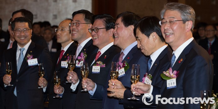 (서울=포커스뉴스) 5일 오후 서울 중구 롯데호텔에서 열린 '2016년 범금융 신년인사회'에 임종룡(오른쪽부터) 금융위원장, 이주열 한국은행 총재, 최경환 경제부총리 겸 기획재정부 장관, 정우택 국회 정무위원장, 김기식 정무위원회 간사, 추경호 국무조정실장, 진웅섭 금융감독원장이 참석하고 있다.