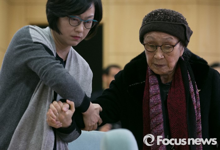 (서울=포커스뉴스) 5일 오후 서울 여의도 국회 의원회관에서 민주사회를 위한 변호사모임, 한국정신대문제대책협의회 등 주최로 열린 긴급진단, 2015년 한일 외교 장관 회담의 문제점 토론회에 참석한 위안부 피해자 김복동 할머니가 회담을 인정할 수 없는 이유에 대한 발언을 마친 뒤 단상에서 내려오고 있다.