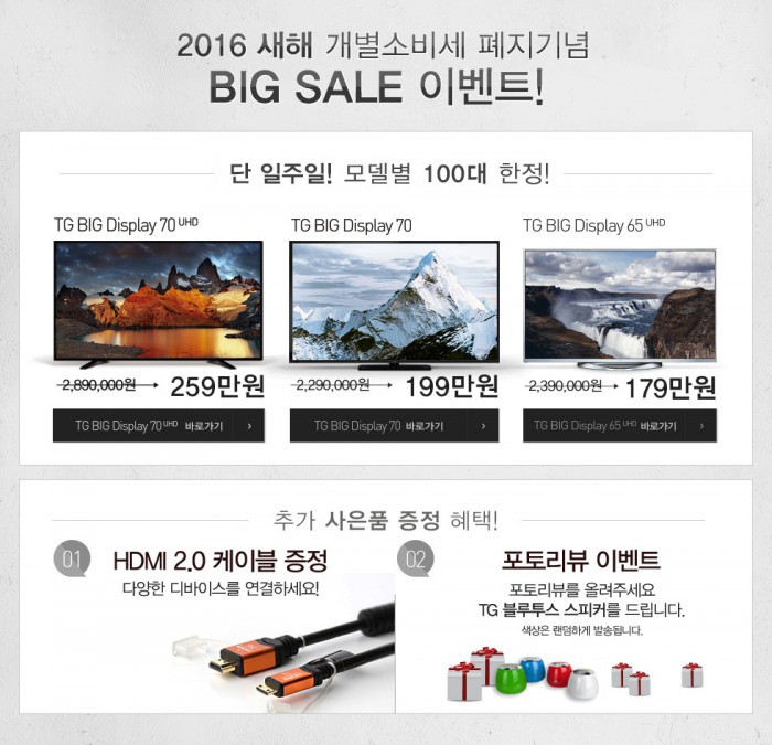 (서울=포커스뉴스) TG앤컴퍼니(대표이사 이홍선)는 오는 10일까지 2016년 새해 개별소비세 폐지를 기념해 온라인 오픈마켓 11번가와 할인 이벤트를 진행한다. 이번 할인 이벤트는 TG빅디스플레이 70초고화질(UHD)·65UHD·70FHD가 대상이며 모델별 100대 한정으로 진행된다.