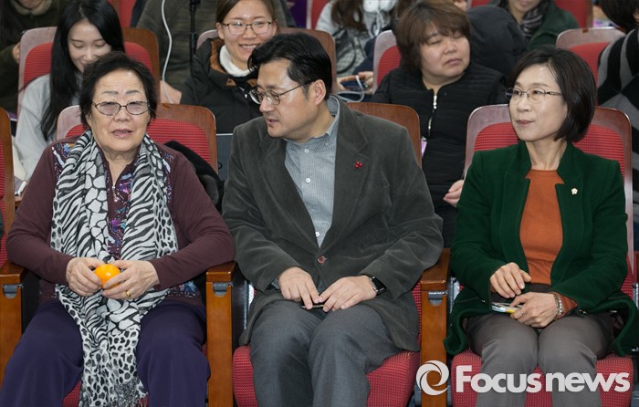 (서울=포커스뉴스) 5일 오후 서울 여의도 국회 의원회관에서 민주사회를 위한 변호사모임, 한국정신대문제대책협의회 등 주최로 열린 긴급진단, 2015년 한일 외교 장관 회담의 문제점 토론회에 참석한 더불어민주당 소속 홍익표(가운데) 여성가족위원회 일본군위안부문제대책소위원장과 위안부 피해자 이용수(왼쪽) 할머니가 대화하고 있다. 오른쪽은 여성가족위원회 소속 김제남 정의당 의원.