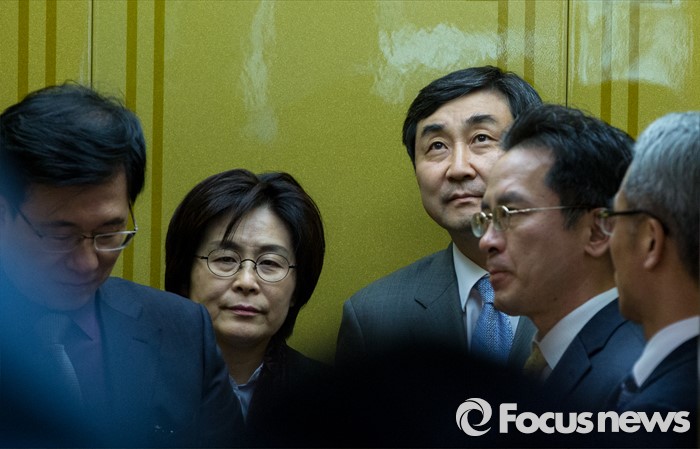 (서울=포커스뉴스) 이종걸(가운데) 더불어민주당 원내대표와 유승희, 신경민, 남인순 의원이 한일간 위안부 협상과 관련해 5일 오후 서울 종로구 외교부 청사를 항의 방문하고 있다.
