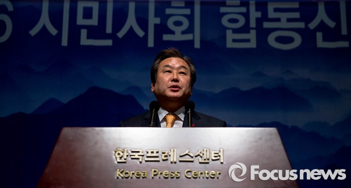 (서울=포커스뉴스) 김무성 새누리당 대표가 5일 오후 서울 중구 프레스센터에서 열린 ‘2016 시민사회 합동 신년회’에 참석, 참석자들을 향해 축사를 건내고 있다.