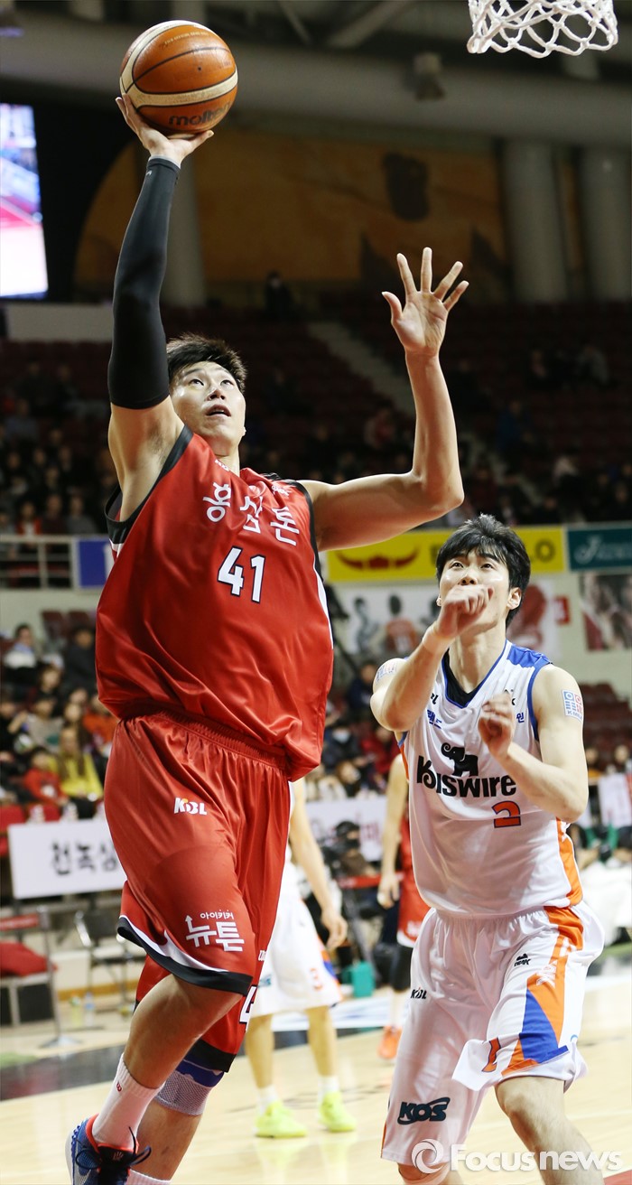 (안양=포커스뉴스) 5일 안양실내체육관에서 열린 2015-2016 프로농구 KGC-전자랜드 경기에서 KGC 오세근이 전자랜드 이정제의 수비를 뚫고 레이업슛을 시도하고 있다.