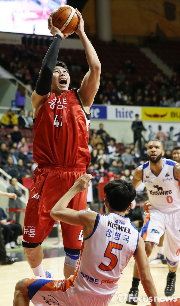 (안양=포커스뉴스) 5일 안양실내체육관에서 열린 2015-2016 프로농구 KGC-전자랜드 경기에서 KGC 오세근이 전자랜드 정병국의 마크를 제치며 점프슛을 쏘고 있다.