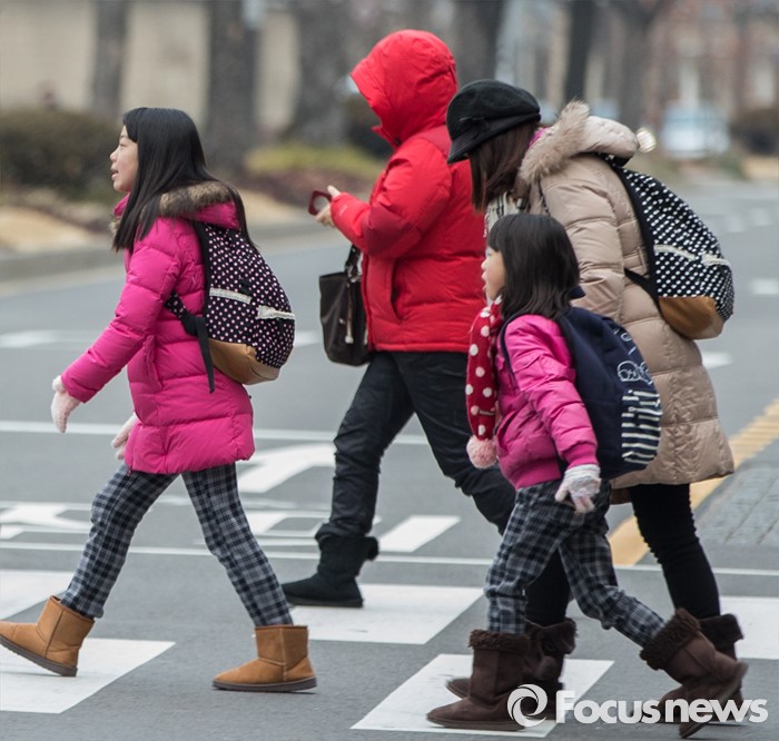 (서울=포커스뉴스) 겨울의 다섯번째 절기인 소한인 6일 아침 서울 종로구 광화문에서 엄마와 아이들이 횡단보도를 건너고 있다.