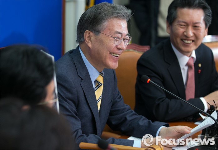 (서울=포커스뉴스) 문재인 더불어민주당 대표가 6일 오전 서울 여의도 국회에서 열린 최고위원회의에 참석해 모두발언 중 미소를 짓고 있다.