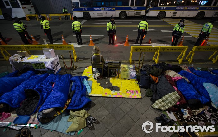 (서울=포커스뉴스) 세계 최장기 집회, 24주년 수요집회가 열리는6일 오전 서울 종로구 위안부 소녀상 앞 기온은 영하 4도, 강추위에 소녀상 이전을 반대하는 대학생들이 길바닥에서 잠을 자고 있다.