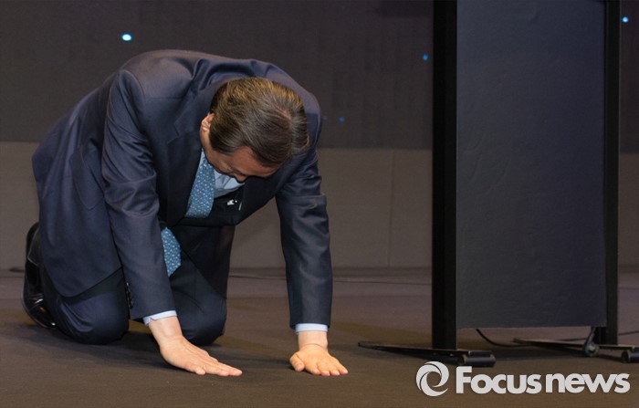 (서울=포커스뉴스) 김무성 새누리당 대표가 6일 오전 서울 영등포구 글래드호텔에서 열린 대한민국헌정회 신년인사모임에서 참석자들에게 새해 인사로 절을 하고 있다.
