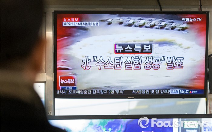 (서울=포커스뉴스) 북한이 첫 수소탄 핵실험을 실시했다고 발표한 6일 오후 서울 서초구 고속버스터미널에서 시민들이 이에 관련된 뉴스특보를 시청하고 있다.