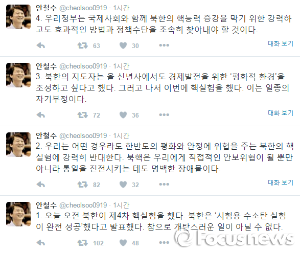 한편, 북한은 이날 수소탄 실험에 성공했다고 밝혔다. 북한 조선중앙TV는 6일 오후 12시30분 '주체조선의 첫 수소탄시험 완전성공'을 방송하며 "주체조선의 첫 수소탄 실험이 완전 성공했다"고 했다.무소속 안철수 의원이 6일 자신의 트위터에 북한의 핵실험을 비판하는 글을 올렸다. <사진출처=안철수 의원 트위터>